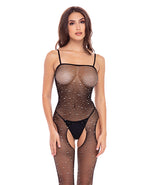 Let your inner sparkle shine in this fishnet bodystocking. Shimmery rhinestones adorn garment. Non-adjustable stretch straps with straight back. Provocative crotchless front and open back. Ultra-sheer stretch nylon. G-string shown not included. Content: Body: 92% Nylon, 8% Spandex. Care : Hand wash, line dry. One size. Bust: 32in.-38in. Waist: 24in.-30in. Hip: 34in.-40in. Cup: B/C. Dress: 4-12.