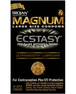 Height: 5.250Length: 3.250Diameter: 1.750TROJAN MAGNUM ECSTASY Large Size Condoms. The Gold Standard in comfort and protection. Accept No Substitutes. These condoms feature a unique design that lets you feel the pleasure, not the condom! Feels like nothing's there! The larger, comfort shape allows for freedom of movement for a more natural experience with a tapered, textured base to ensure a secure fit and stimulation. UltraSmooth premium lubricant inside and out ensures extra comfort and sensitivity for both partners. They're made from a premium quality latex and are electronically tested to help ensure reliability. These condoms reduce the risk of unintended pregnancy and sexually transmitted infections (STIs) while you play.SHIP FROM : USASHIP TO : USA, CANADA