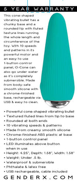 This cone-shaped vibrating bullet has a chunky base and a rounded tip with fluted texture lines running the whole length and circumference of the toy. With 10 speeds and patterns in its powerful motor and an easy to use 1-button control panel, O-Cone can also go under water as its completely submersible. Made from body-safe smooth silicone with a chrome-finished base, rechargeable via USB and easy to clean. Powerful cone-shaped vibrating bullet Textured fluted lines from tip to base Rounded at both ends 10 vibrating speeds and patterns Made from creamy smooth silicone Chrome-finished ABS plastic at base 1-button control panel LED illuminates above button when in use Waterproof and submersible Phthalate and latex free USB rechargeable, cable included MEASUREMENTS: Height: 4.25" (10.80 cm) Width: 1.58" (4.02 cm)Color: Feature: Multi-FunctionFeature: Multi-SpeedFeature: VibratesFeature: WaterproofFeature: Latex FreeFeature: Phthalate FreeFeature: RechargableSHIP FROM : USASHIP TO : USA